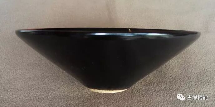 此碗敞口,微敛,斜弧壁,矮圈足,呈斗笠状。碗体里外满施黑釉,施釉均匀,