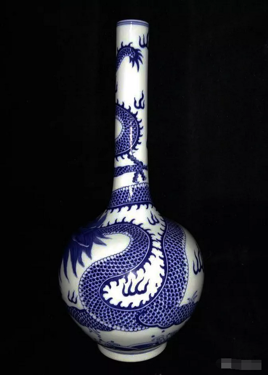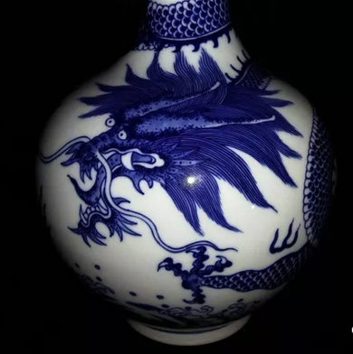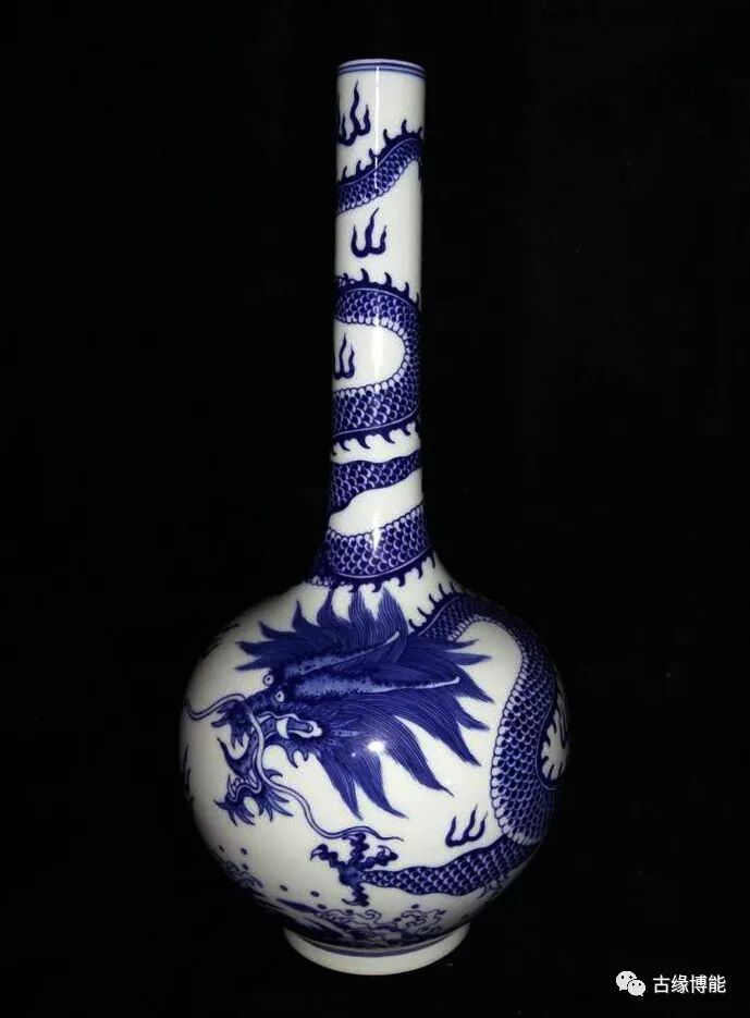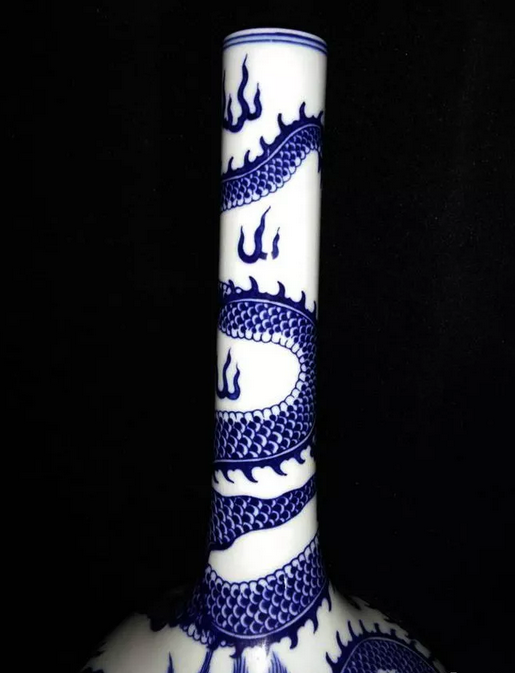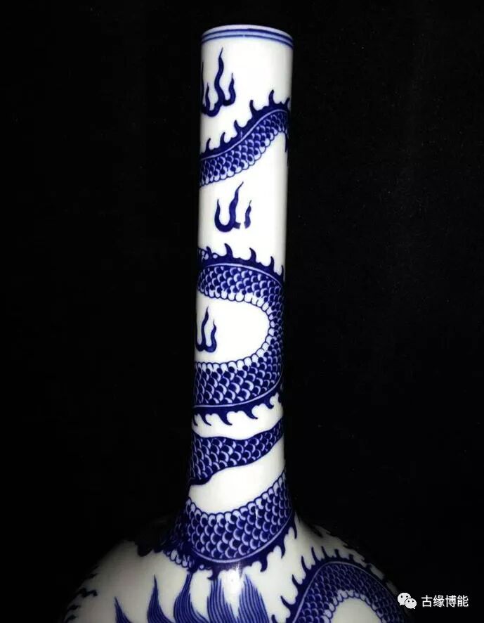 龙身环绕于瓶的直颈处,龙头昂扬于瓶身处,端正威仪,须发飘扬,龙体矫健,俯视张嘴,