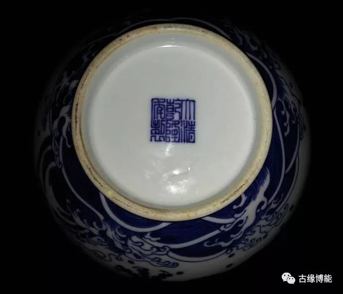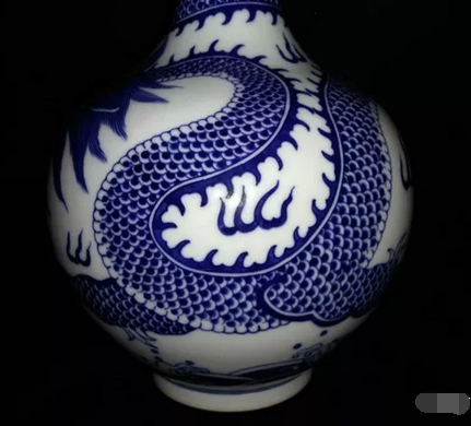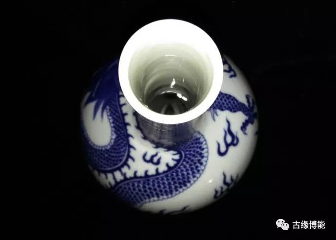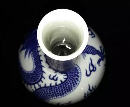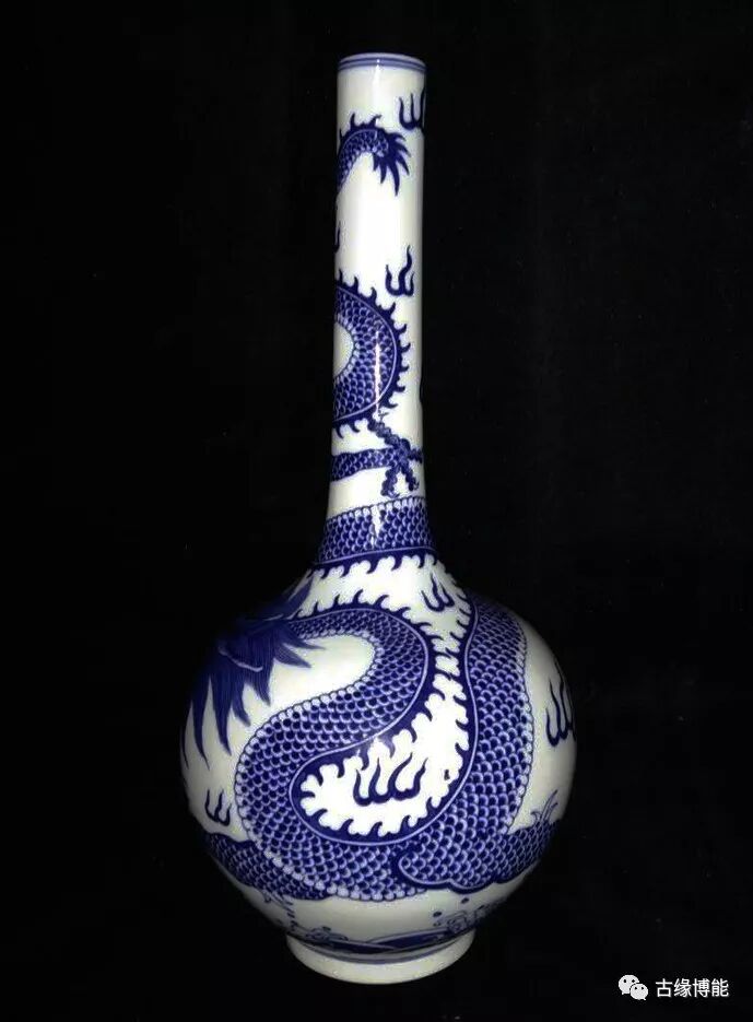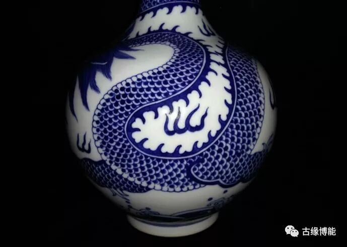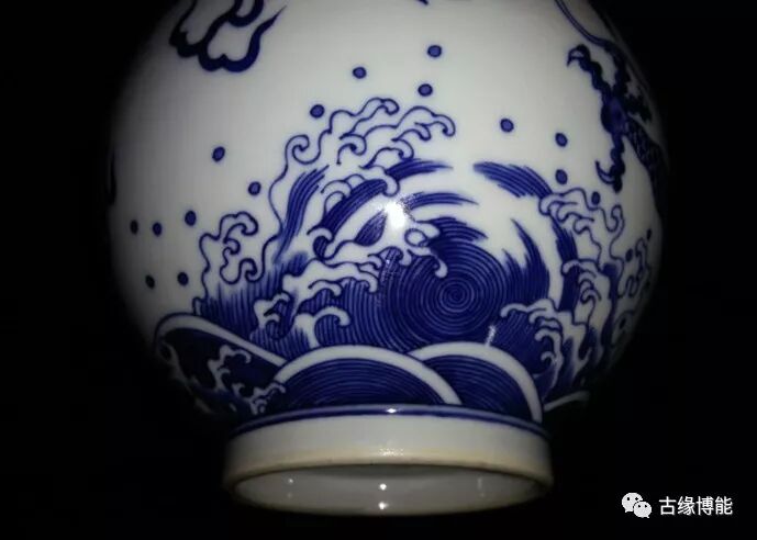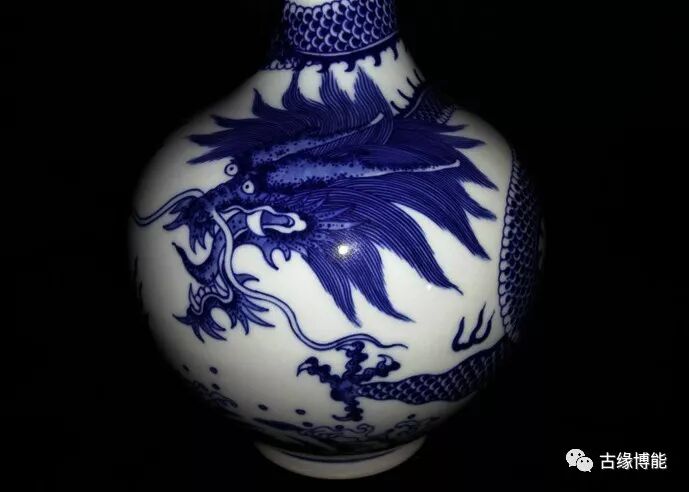 完美的体现出龙与海水之间的交辉相应。此瓶釉面光滑莹润,釉色白中泛青,气泡细小,