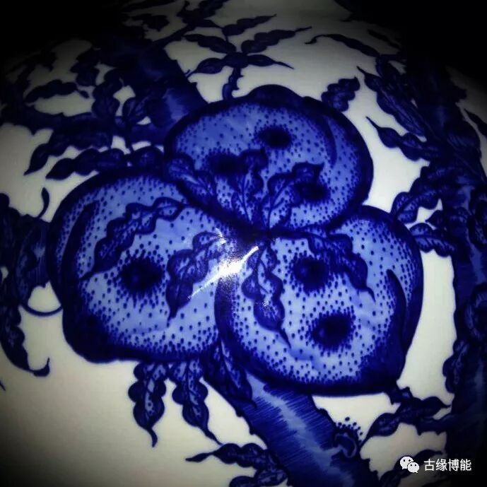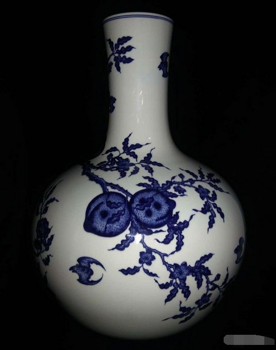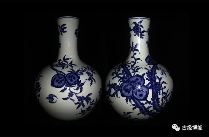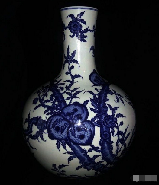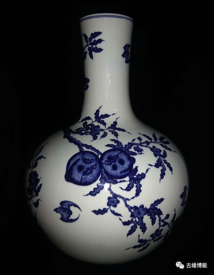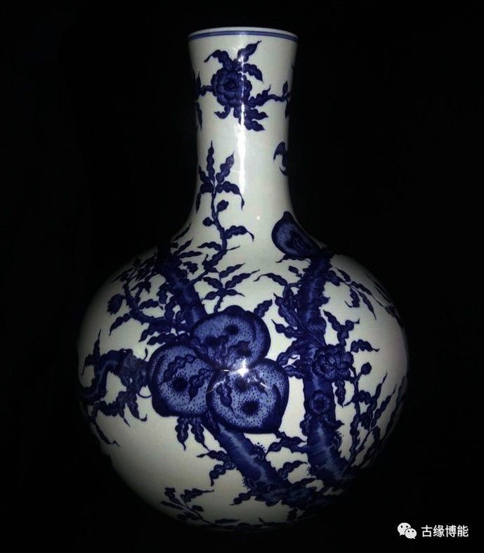 整个天球瓶造型灵巧美观,釉色幽雅隽永,青花浓重,色彩绚丽,引人入胜。乾隆官窑青花瓷既与清幽的康熙青花有别,