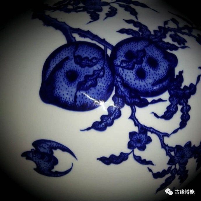 构图疏朗有致,青花釉色浓淡相间,绘画精细工巧。口沿处绘青花双圈,器壁绘青花九桃五蝠纹主题纹饰,