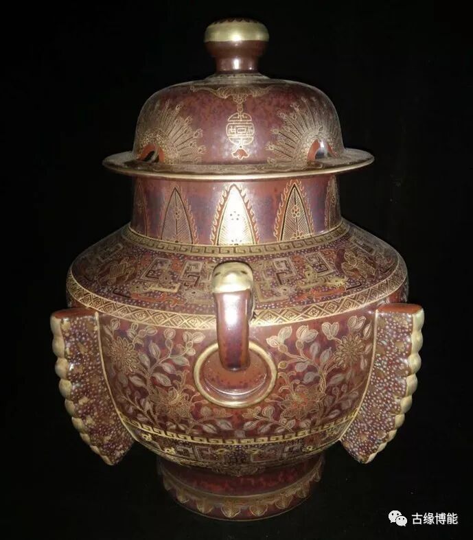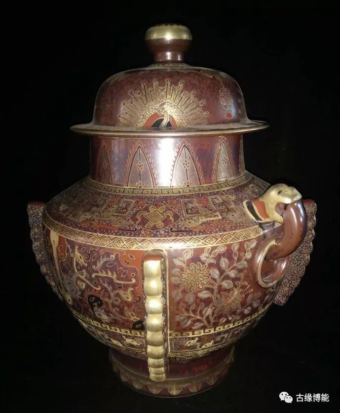 饰以描金,亦常见点饰石青斑彩或褐彩,以拟铜锈之效,而本品逼真,近与铜器相似,确为少见。