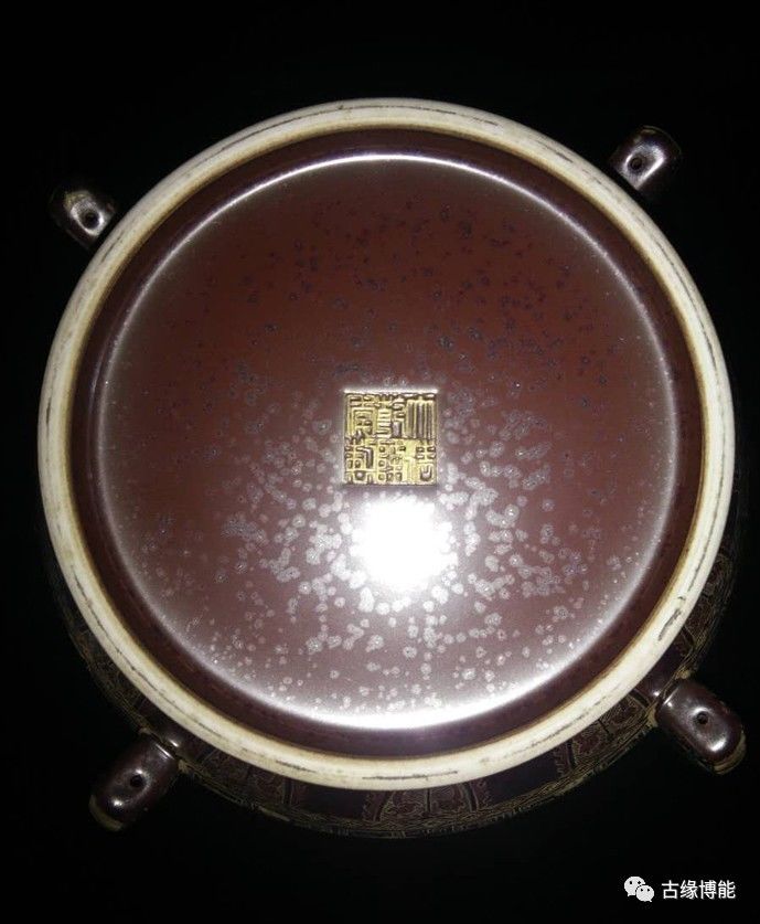 外撇足,足呈泥鳅背,底中心落“大清乾隆年制”六字篆书金款。此藏古铜釉釆用紫金釉或茶叶末釉以摹铜色,