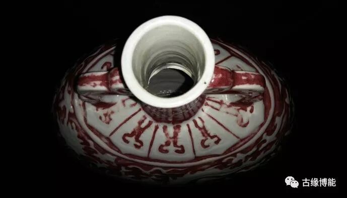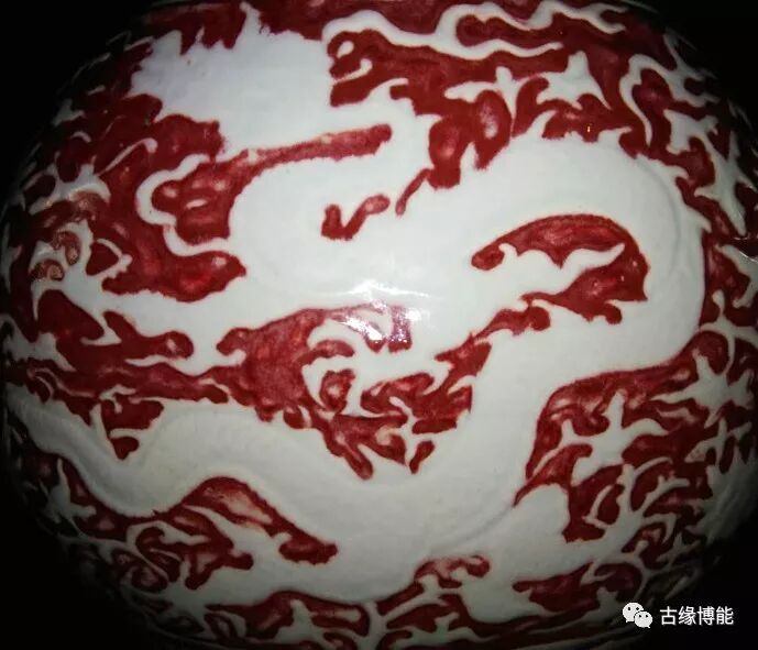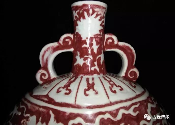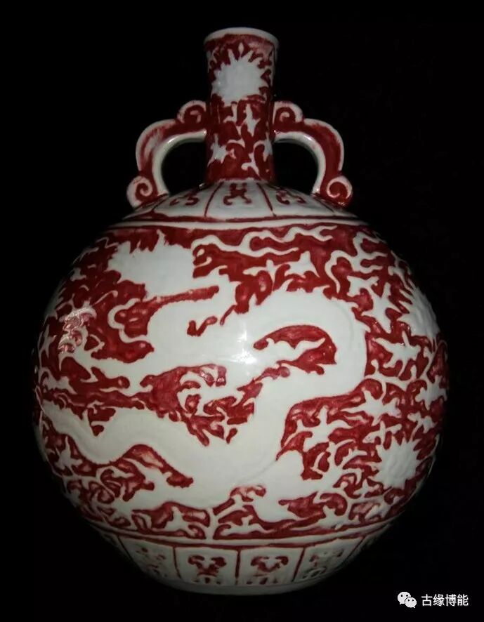 以红釉为海水纹,白釉为缠枝花龙纹为主,红白各占一半,海水浪花翻滚,扁瓶一面龙张嘴吐舌,