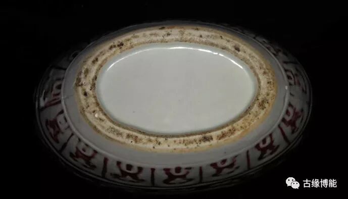 露胎的地方,有显红斑,补胎的混迹明显,胎质透亮,细腻细润。此扁瓶工艺复杂釆用二次烧制而成,