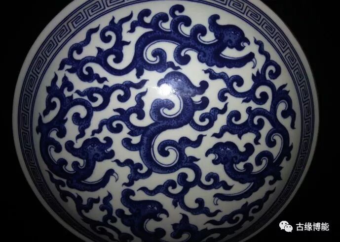 颈部折枝花纹,腹部外回纹一圈,腹部绘主题纹饰五条螭龙纹,条形圈足上卷草纹。