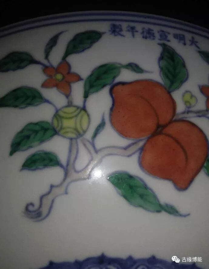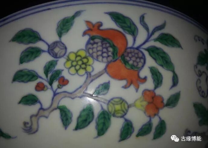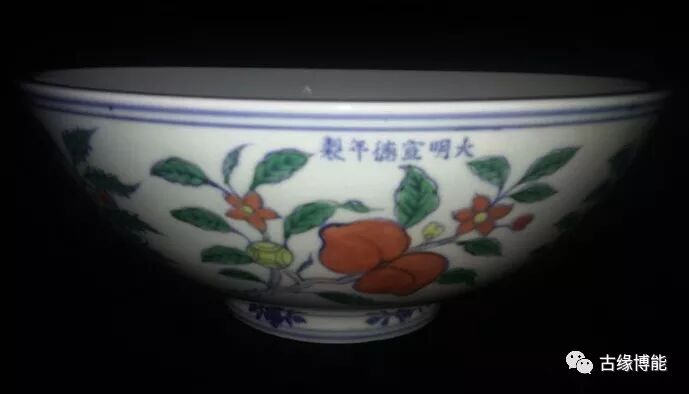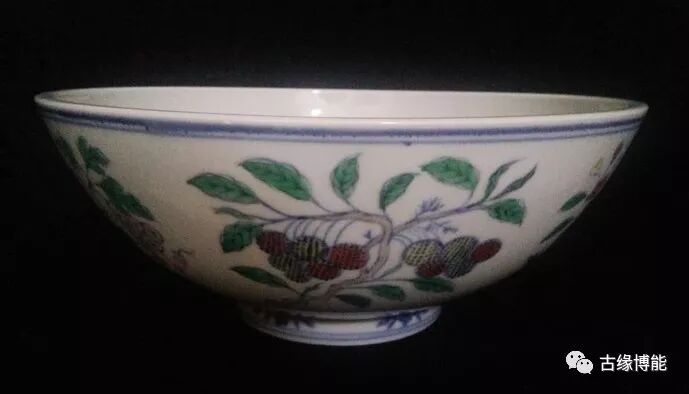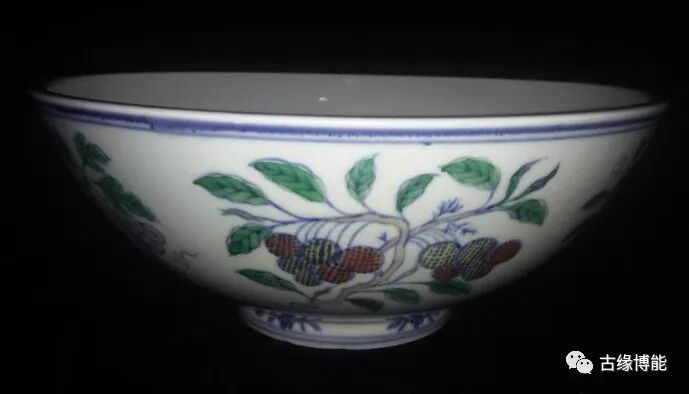 碗周围给画折枝花果,有桃子,石榴,樱桃,山楂,葡萄,荔枝。宣德斗彩尽管稀少,