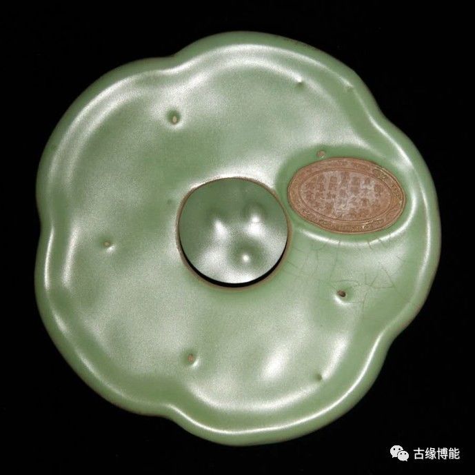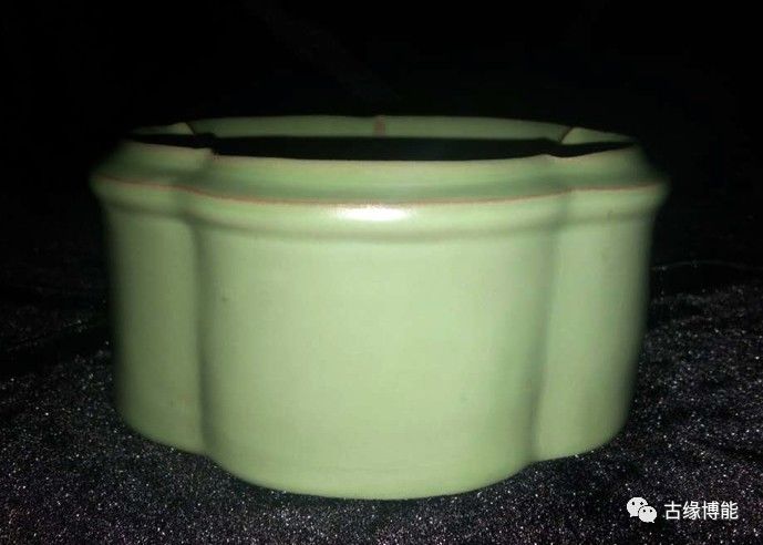此绿釉汝窑五瓣花口,斜肩,花瓣型直腹,腹中空心,凹底,底中空洞,