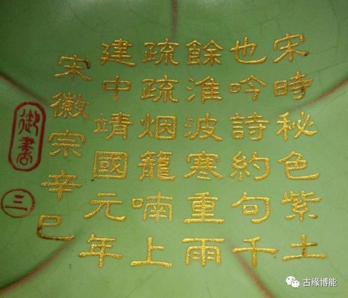 洗子内阴刻描金御题“宋时秘色紫土,也吟诗约句千,餘淮波寒重雨,疏疏烟笼喃上,建中靖國元年,”宋徽宗辛巳 御书。