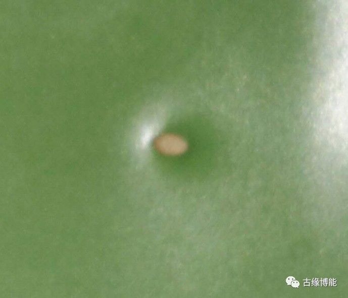 从器底的支钉痕破釉处可看到这种胎骨的本色。器身內外施绿釉,绿釉采用放大镜观看,