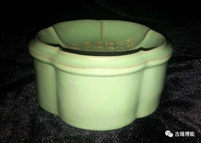名称:汝窑葱绿釉御题描金花瓣型笔子