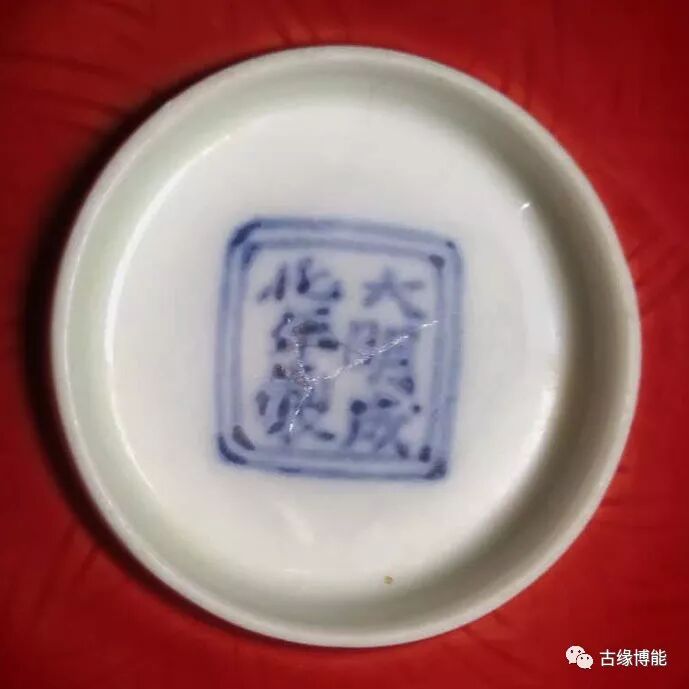 线条柔和。底署“大明成化年制”六字青花楷书款。它的釉面平整、透明,其色柔淡、鲜亮、娇红、娇嫩,不泛紫、不泛黑,