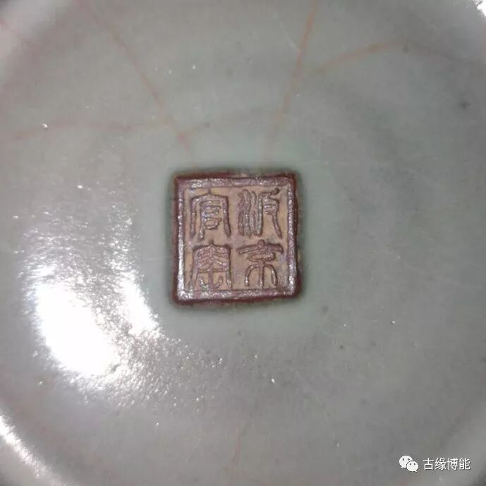 底心凸岀四方块,方块上印篆书款“汴京官窑”。此器通体施粉青釉,釉面比较厚,